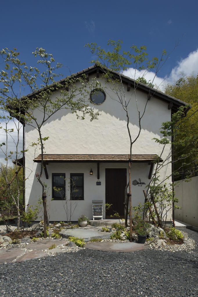 入り口正面から見たデザインにもこだわりが詰まっています。足取りが軽くなるような印象を与える石畳に合わせ、主張しすぎない程度に緑を周囲に飾りました。漆喰の壁の質感と小さな街灯も雰囲気の良さを高めています。