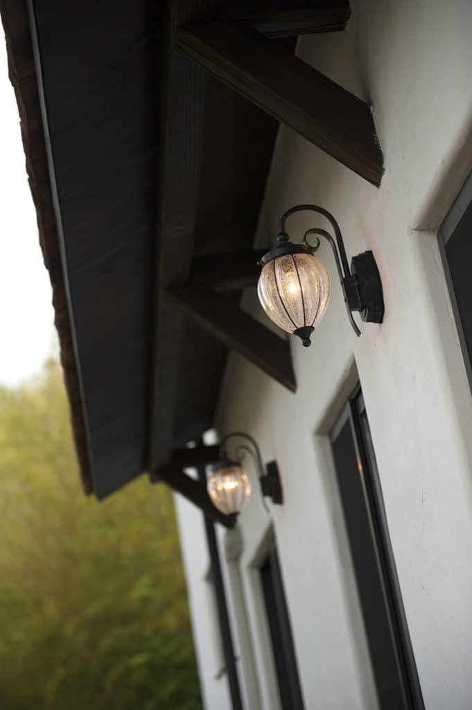 外灯はヨーロッパの街並みをイメージさせるデザイン。ほおずきのようなやわらかな丸みが特徴的です。暗くなる時間帯には、外灯の優しい光が白い壁を優しく照らし、趣きを醸し出します。