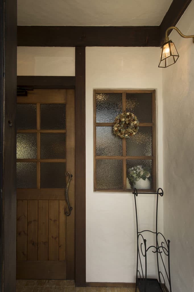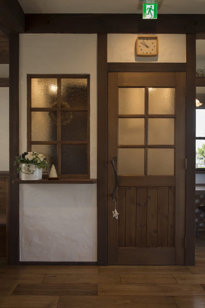 入り口スペースの内扉にはくもりガラスを合わせました。くもりガラスが、照明の光に一層温かみを持たせ、出入りで騒がしくなりがちな入口に落ち着きを与えます。他の来店客などを気にせず、まったりと過ごせるよう配慮されています。