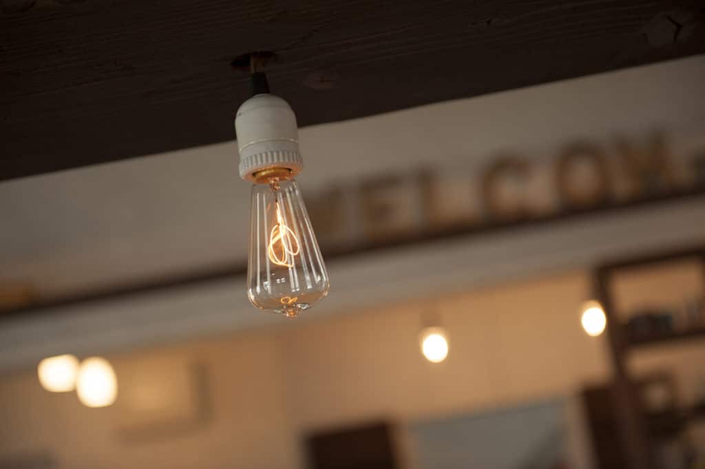 大テーブル上の照明には、レトロな風合いを感じる電球をチョイス。光を発するコイルがまるで揺らぐ炎のようで、ゆるやかな空気が漂うような印象が魅力的です。
