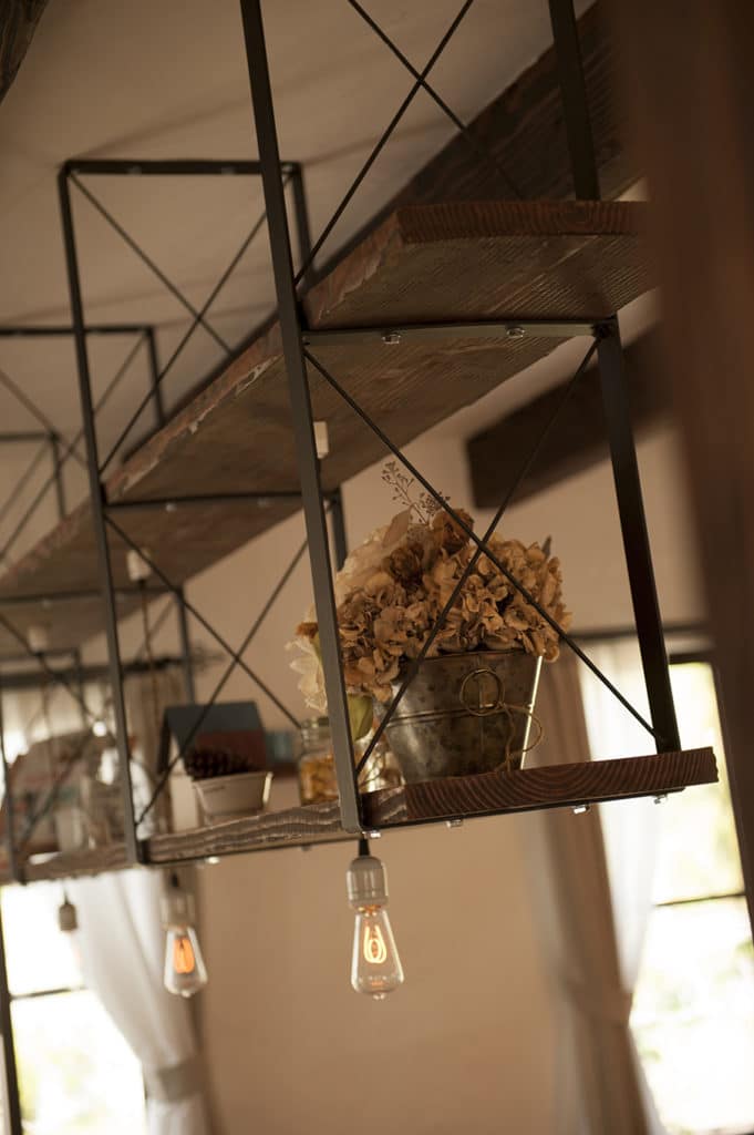 吊り棚にも加工を施した木材を使用。小物や雑貨もアンティーク調に作られたものを選び、周囲と調和した飾り付けを工夫しました。
